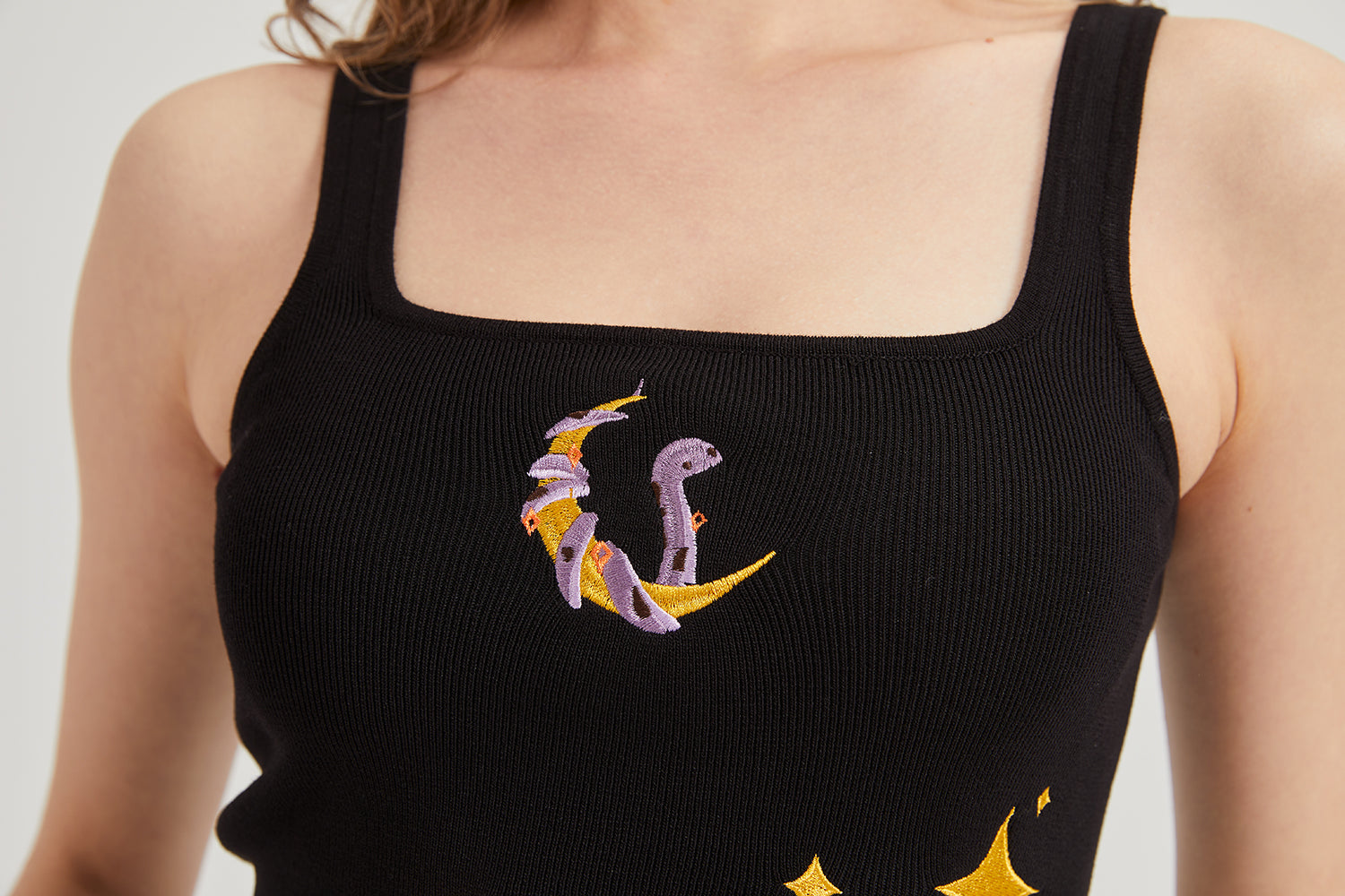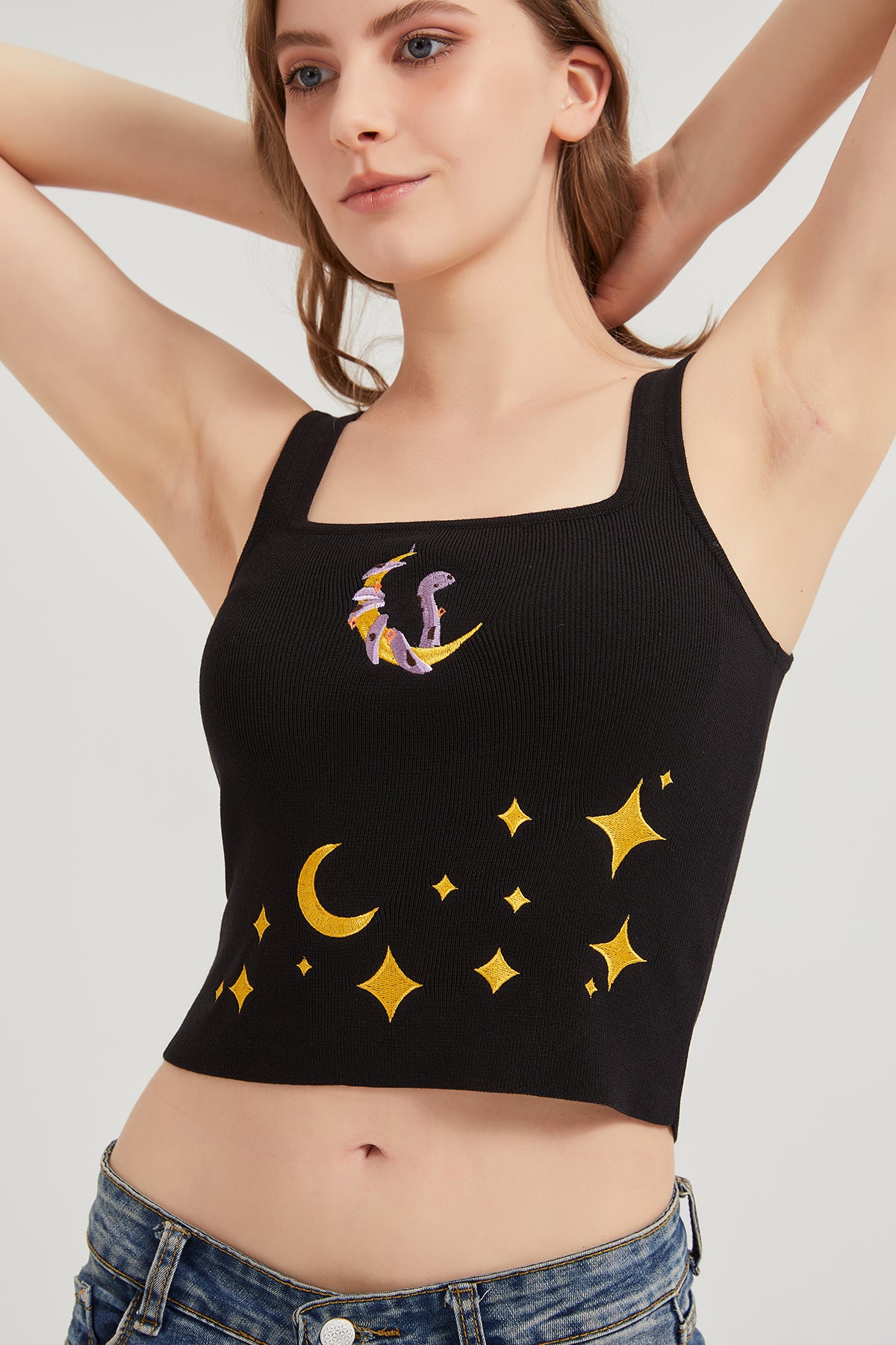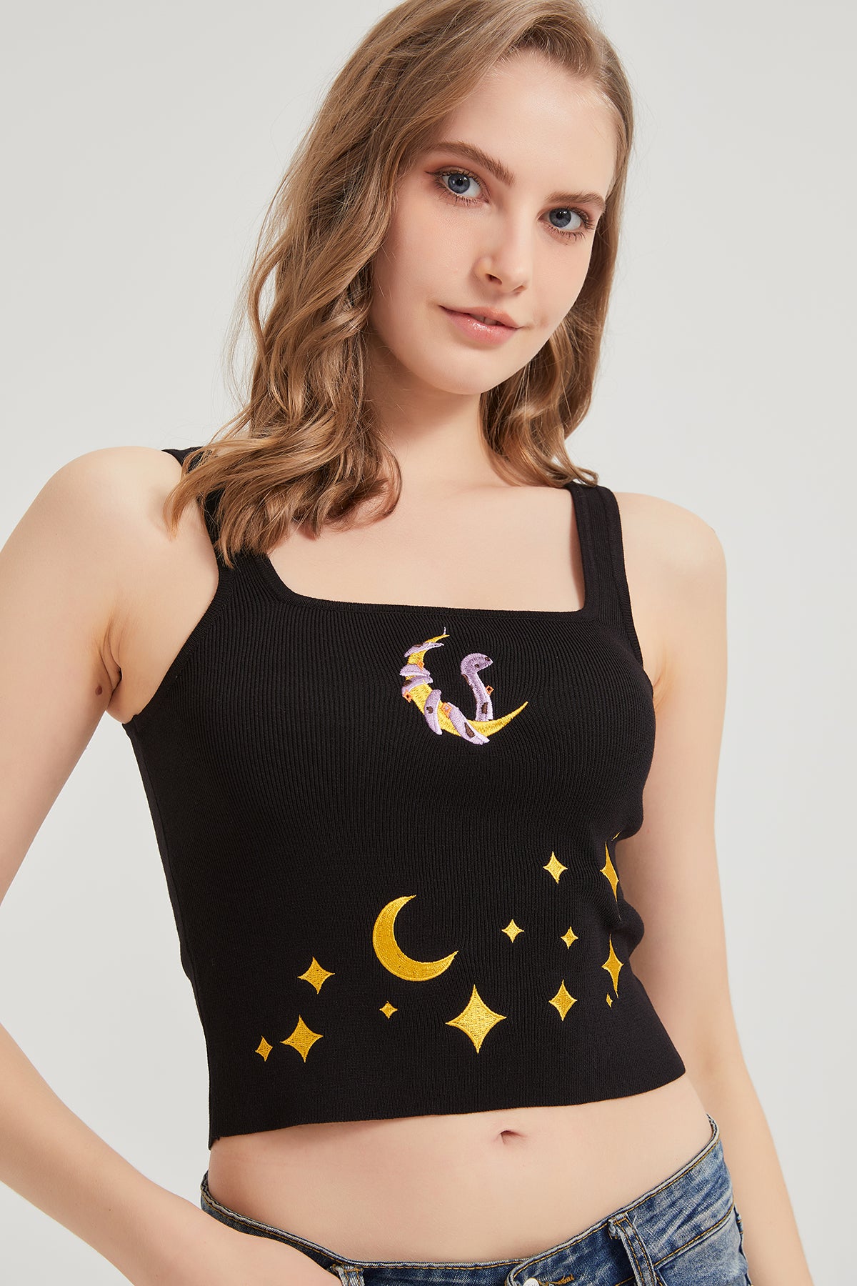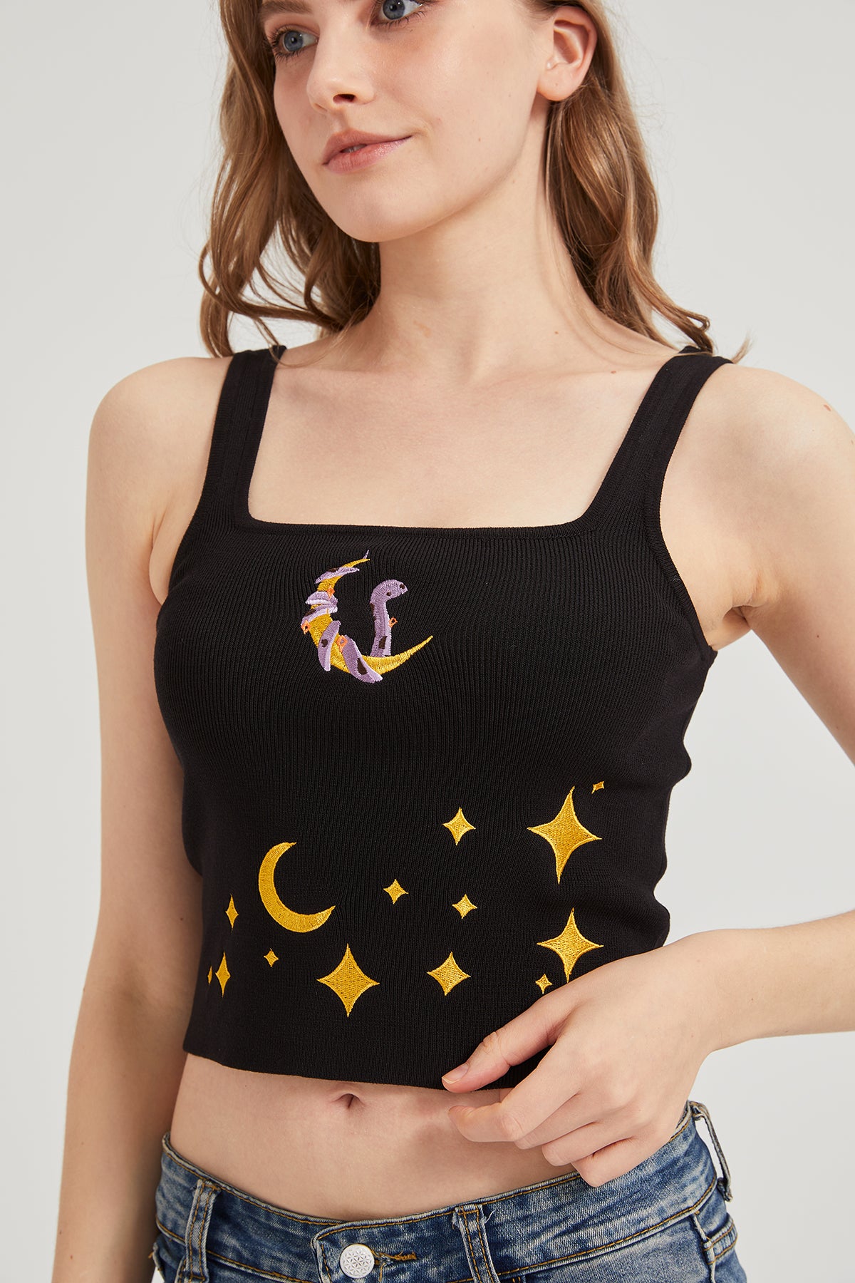 Features: Cropped Fit; A sweater-knit tank top featuring square neck, wide strap, and front moon star snake pattern multi-embroidery.