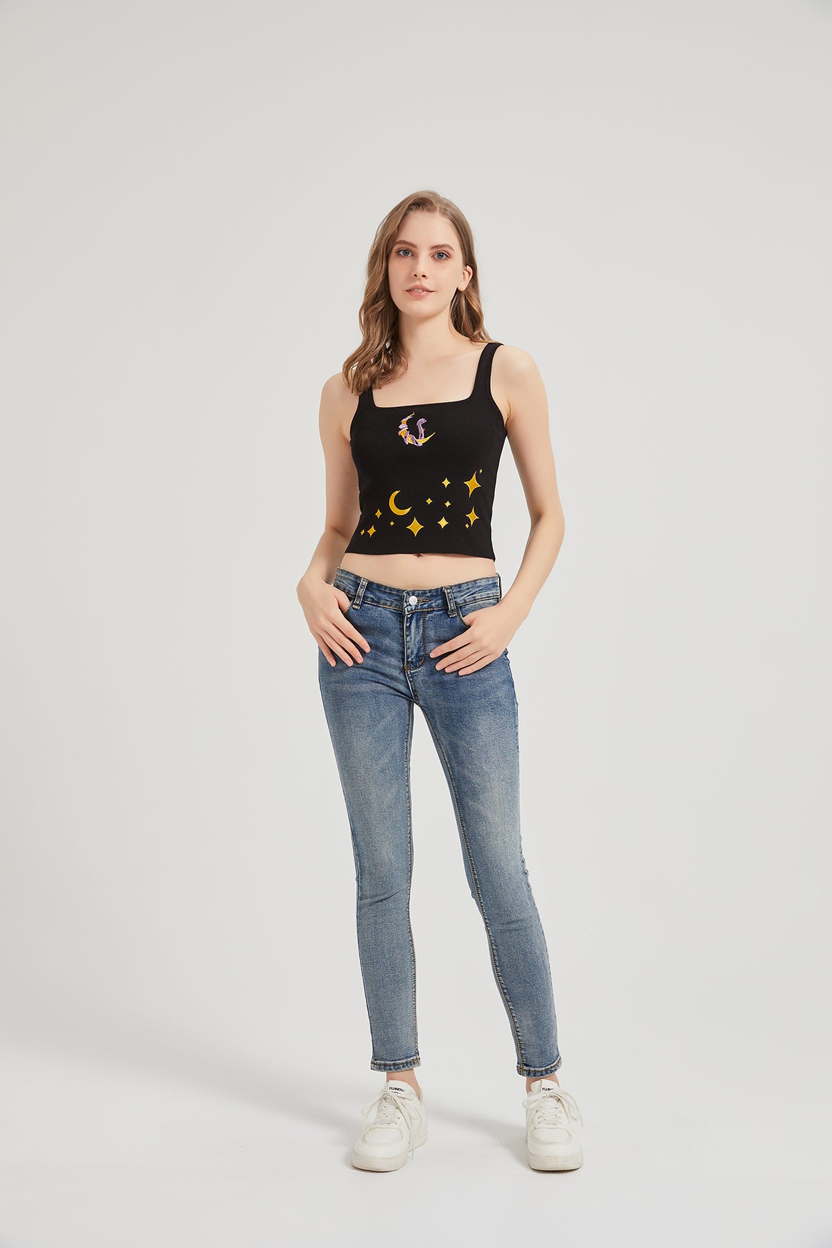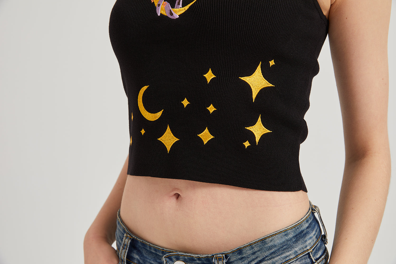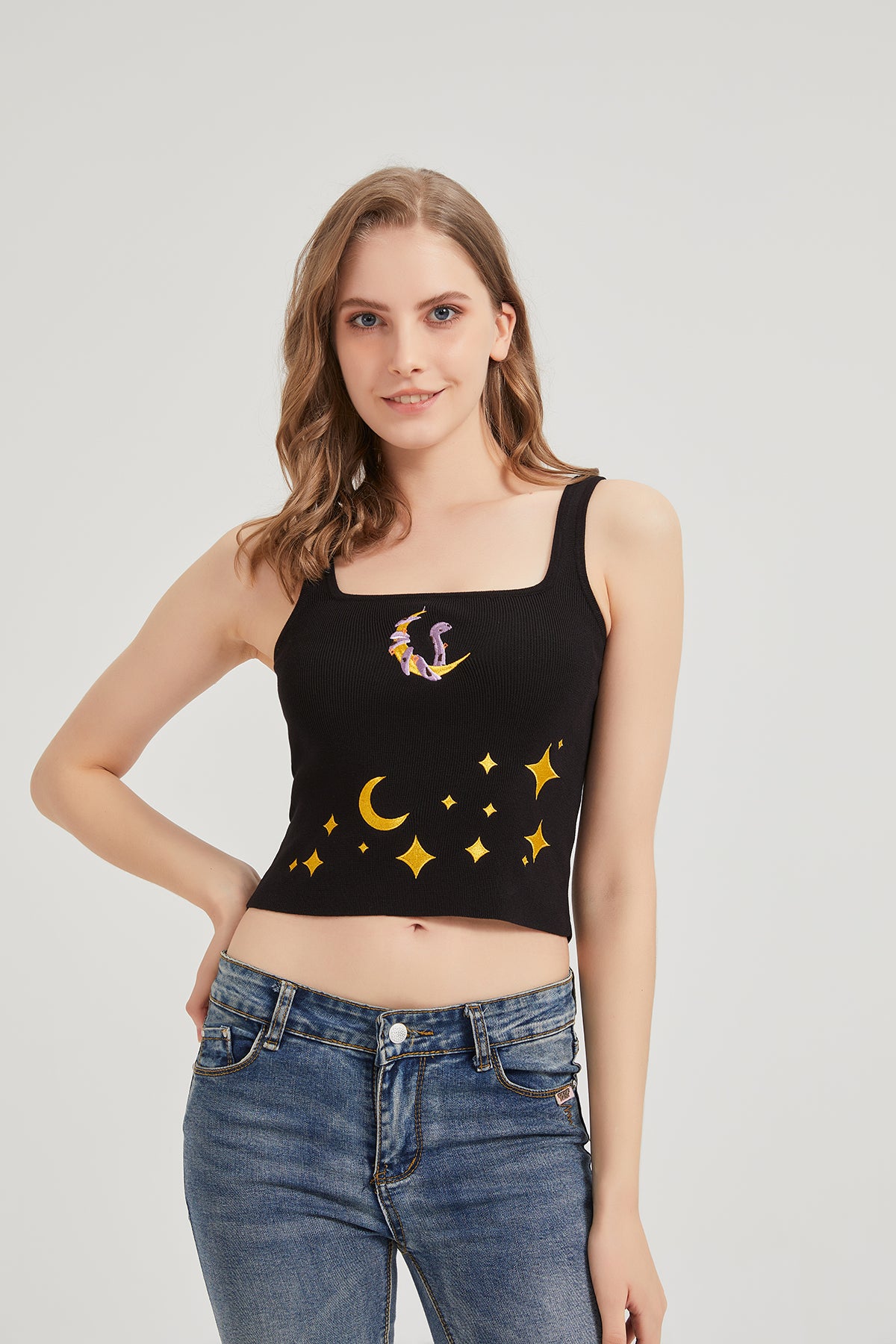 Features: Cropped Fit; A sweater-knit tank top featuring square neck, wide strap, and front moon star snake pattern multi-embroidery.