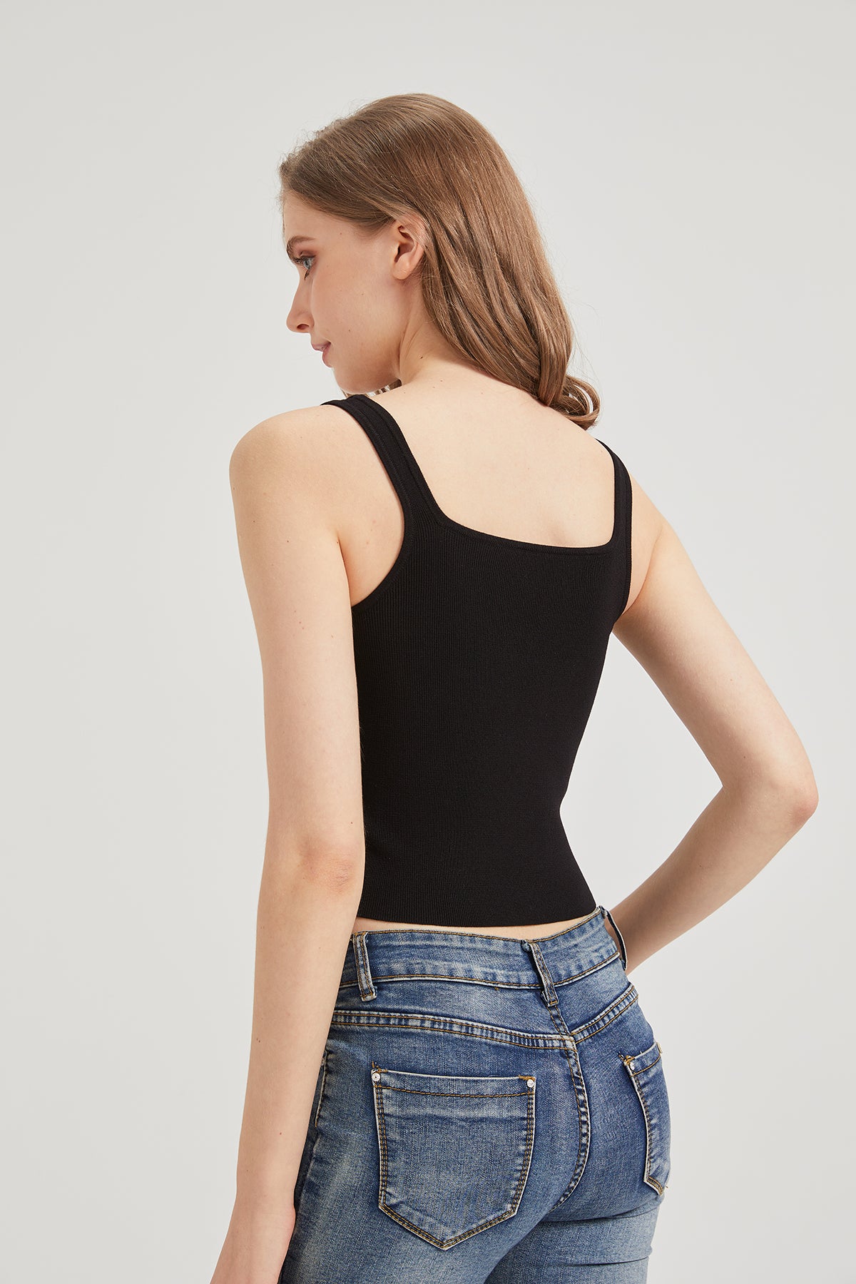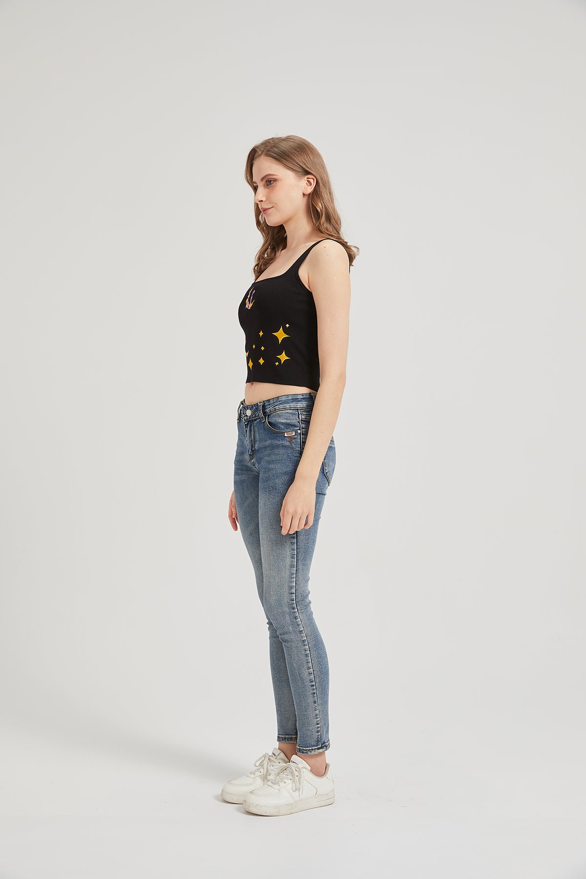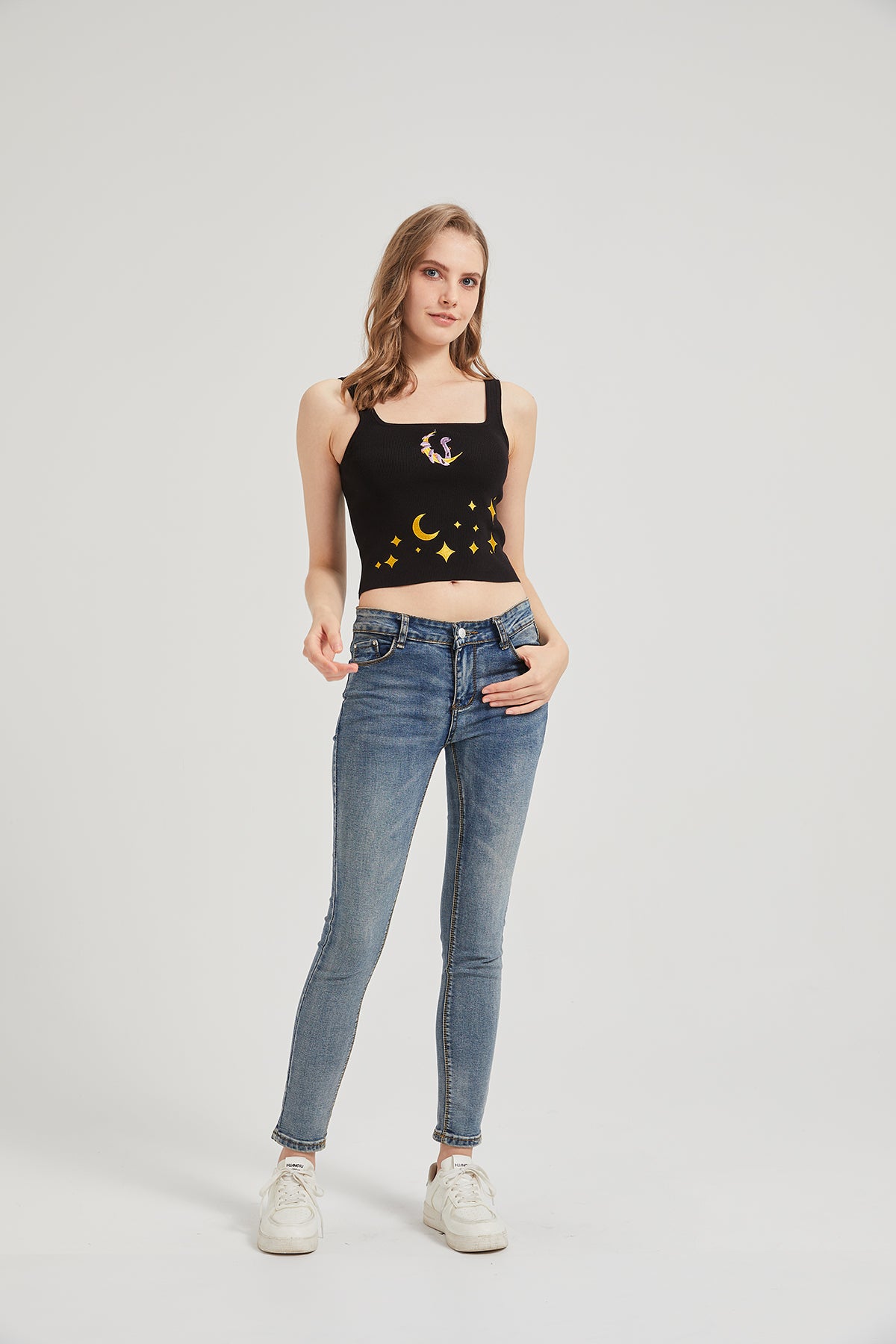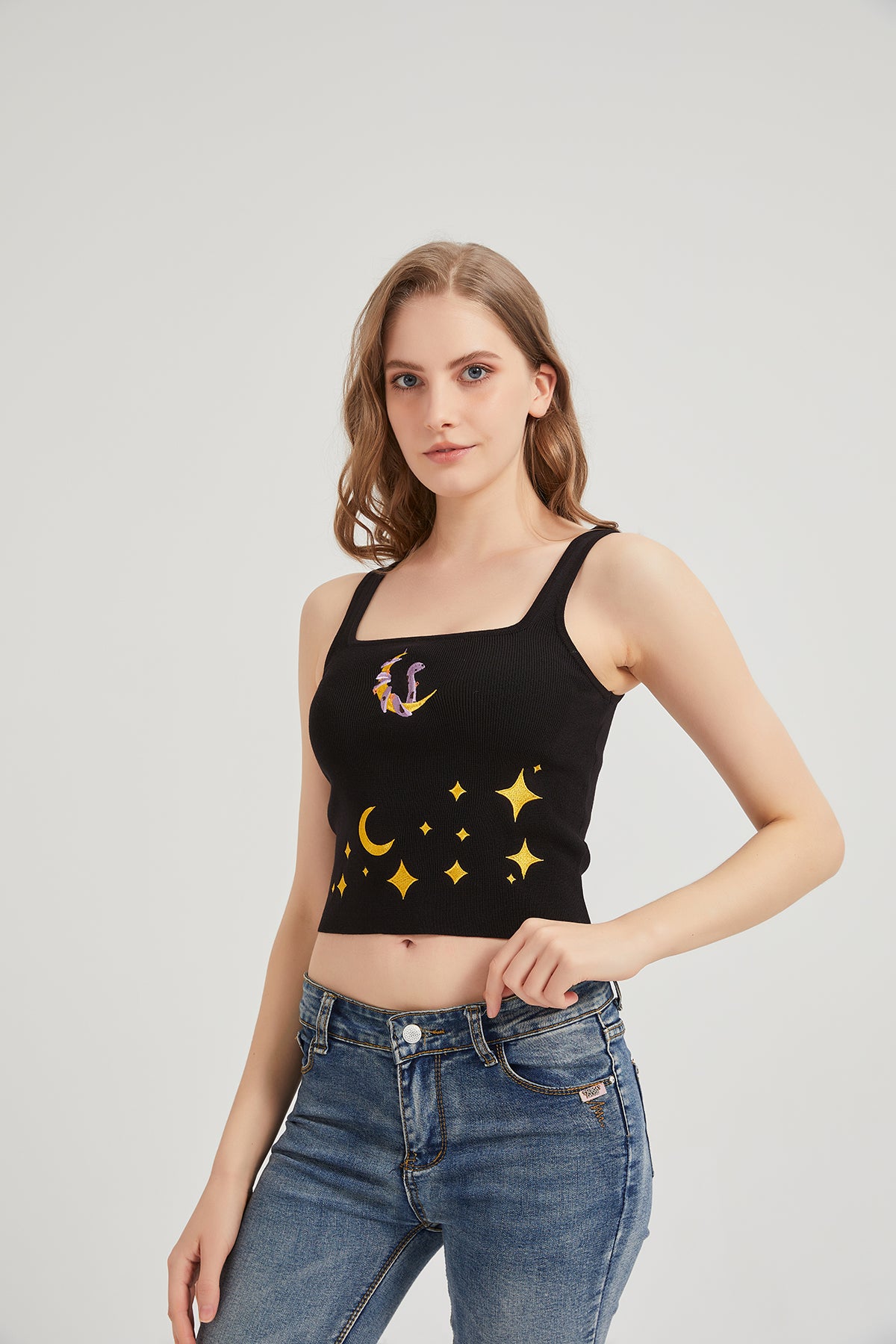 Features: Cropped Fit; A sweater-knit tank top featuring square neck, wide strap, and front moon star snake pattern multi-embroidery.