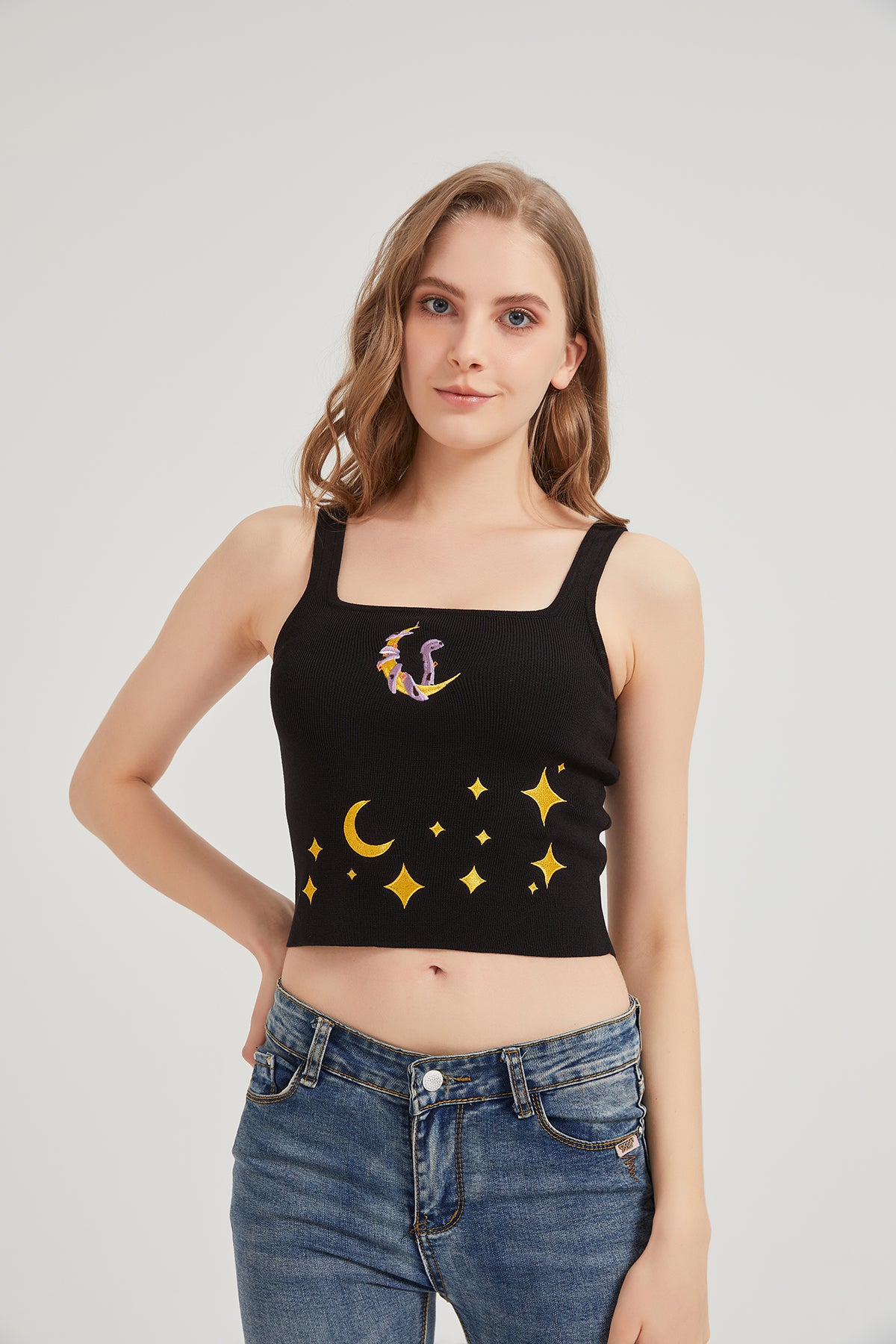 Chibi Moon Snake Embroidered Sweater-Knit Crop Tank Top