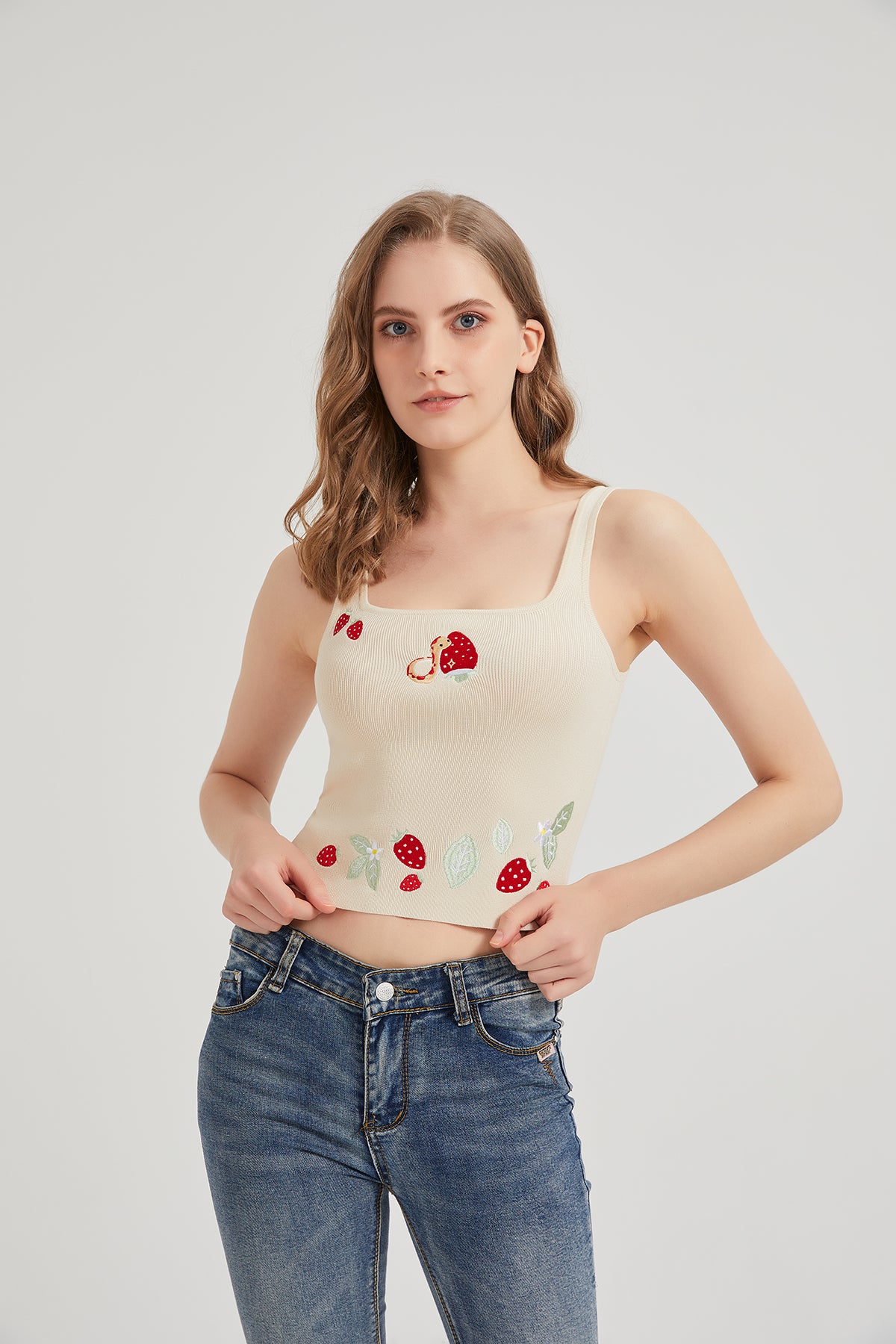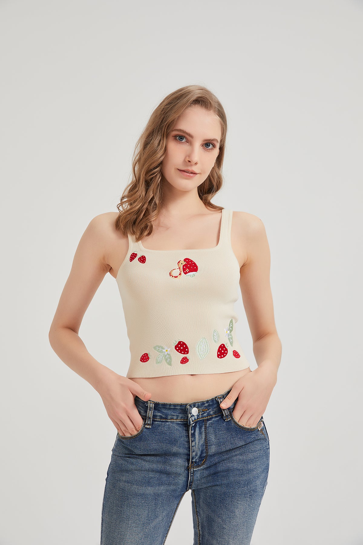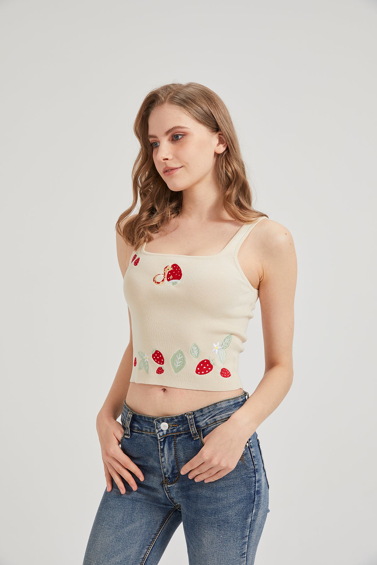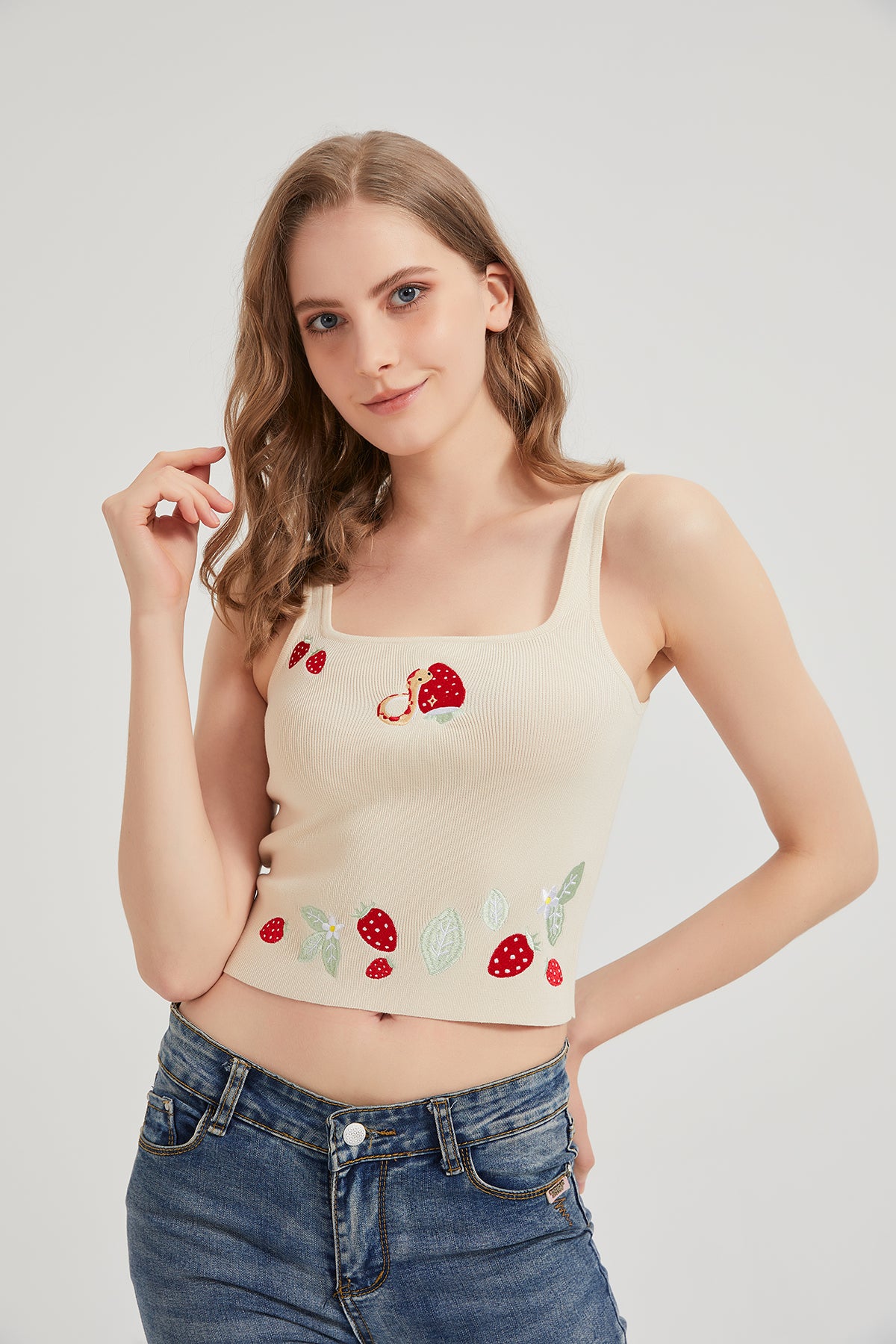 Features: Cropped Fit; A sweater-knit tank top featuring square neck, wide strap, and front sweet strawberry snake pattern multi-embroidery.