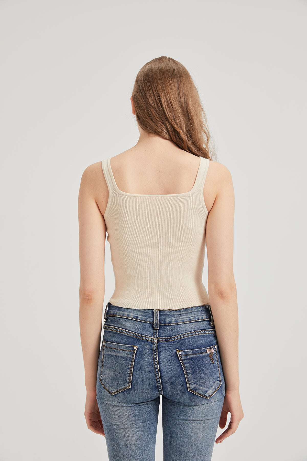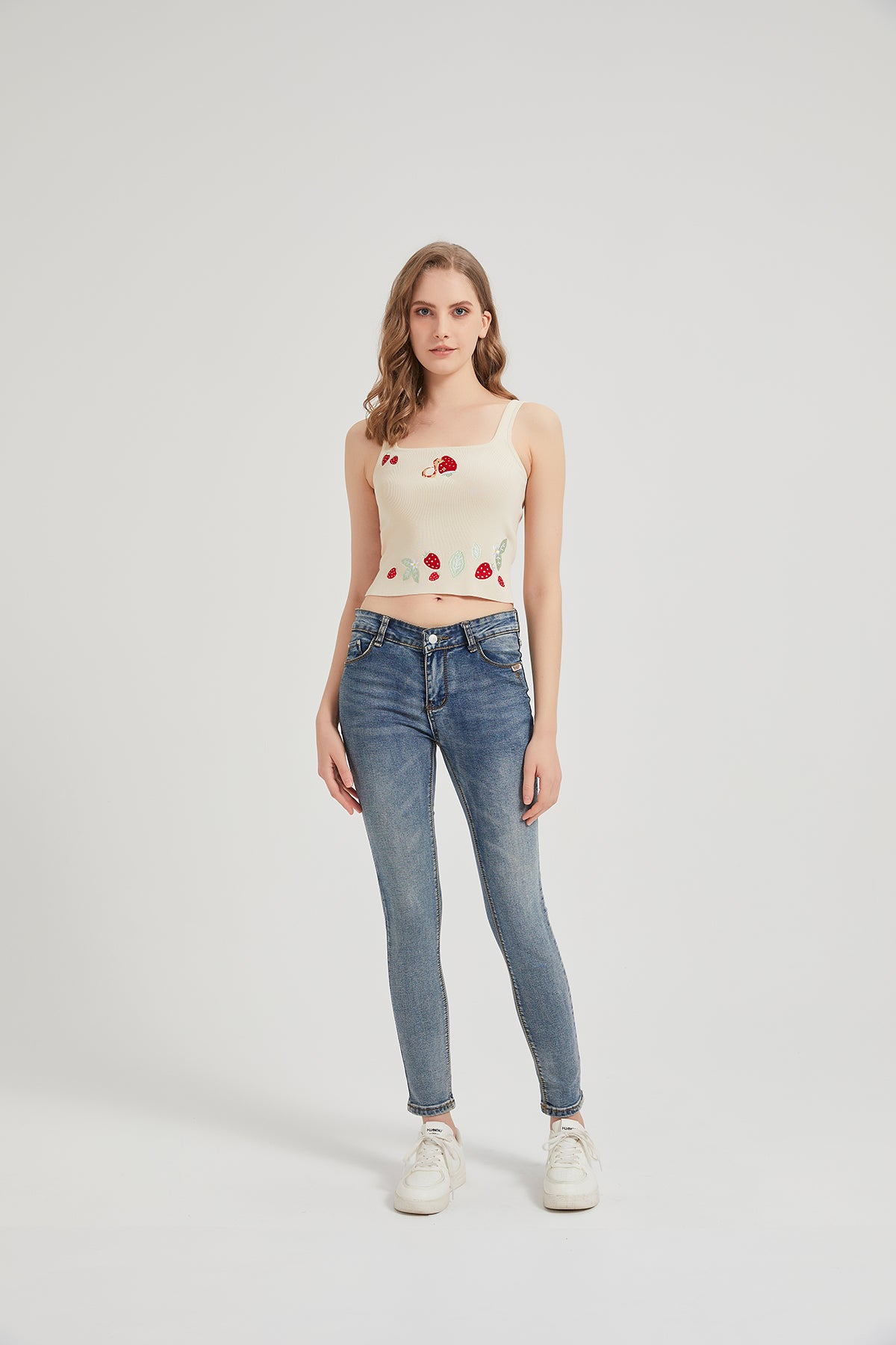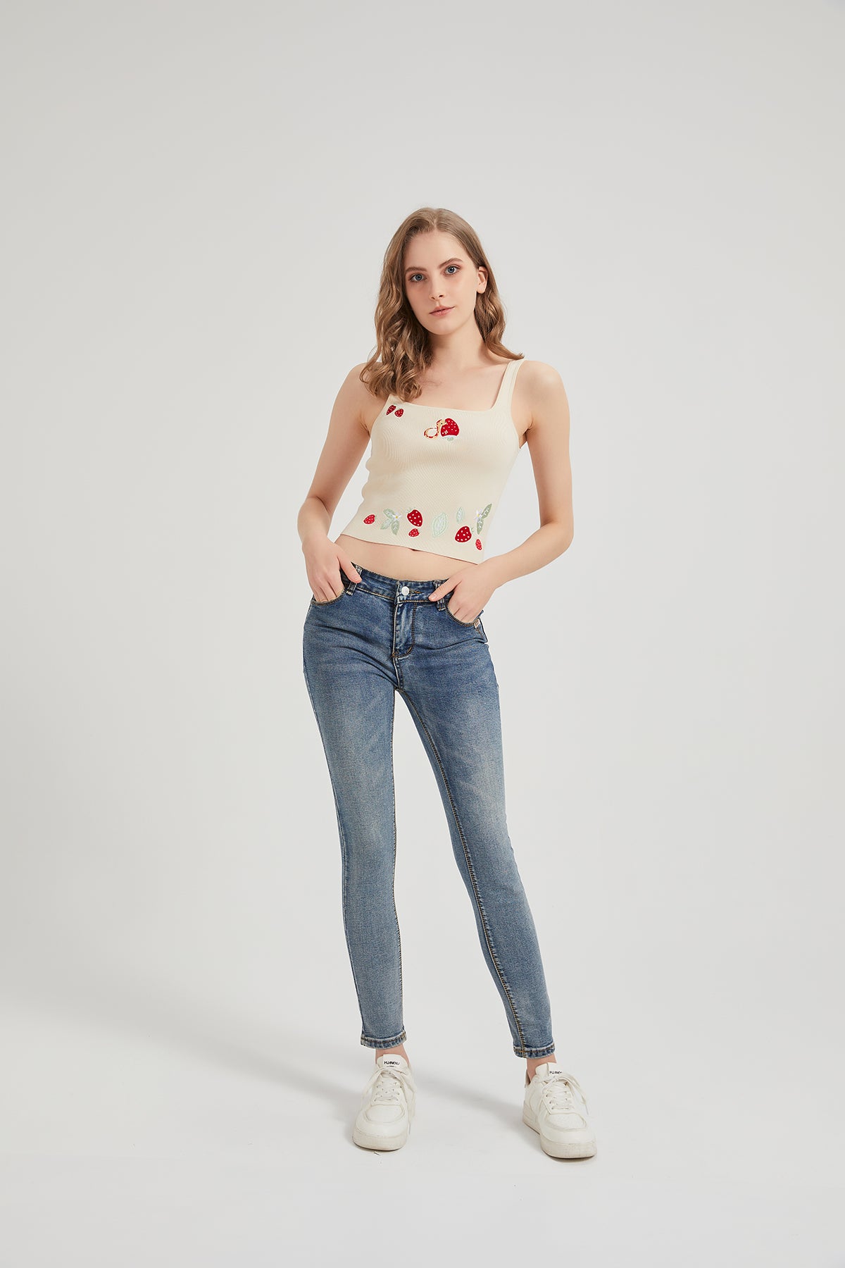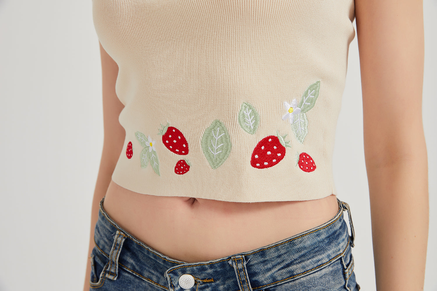 Features: Cropped Fit; A sweater-knit tank top featuring square neck, wide strap, and front sweet strawberry snake pattern multi-embroidery.