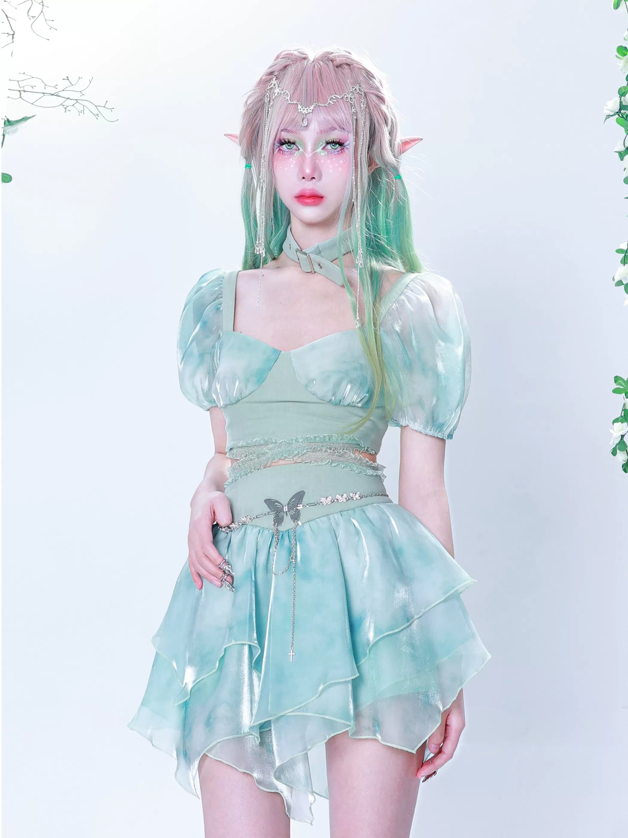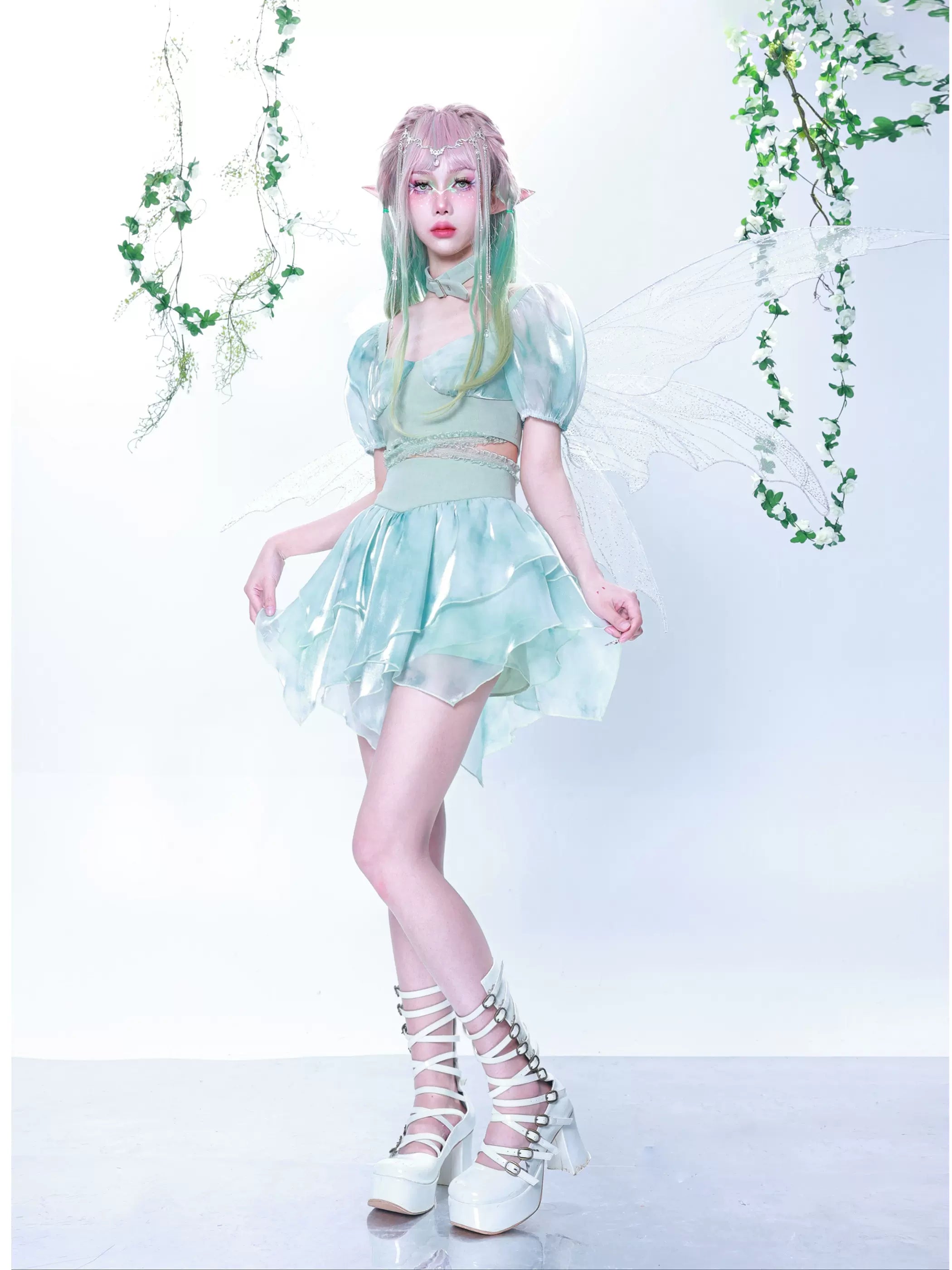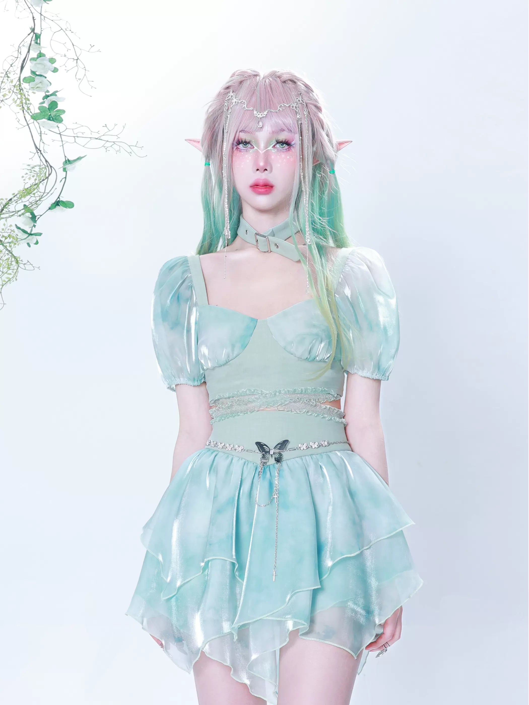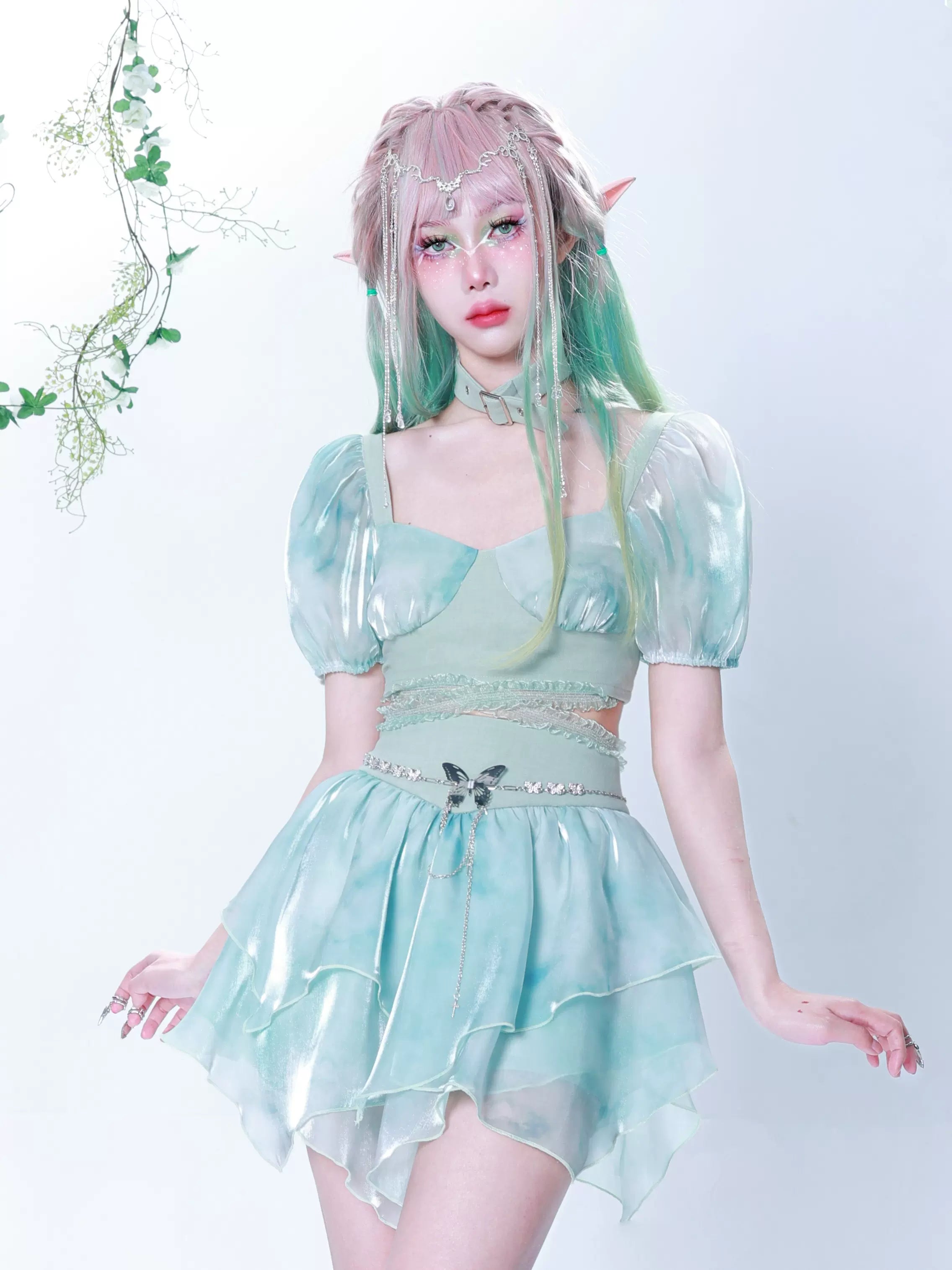 Turquoise Elves Self-tie Sash Waist Puff Sleeves Cropped Top Skirt