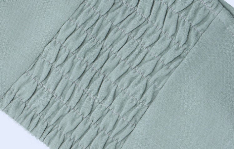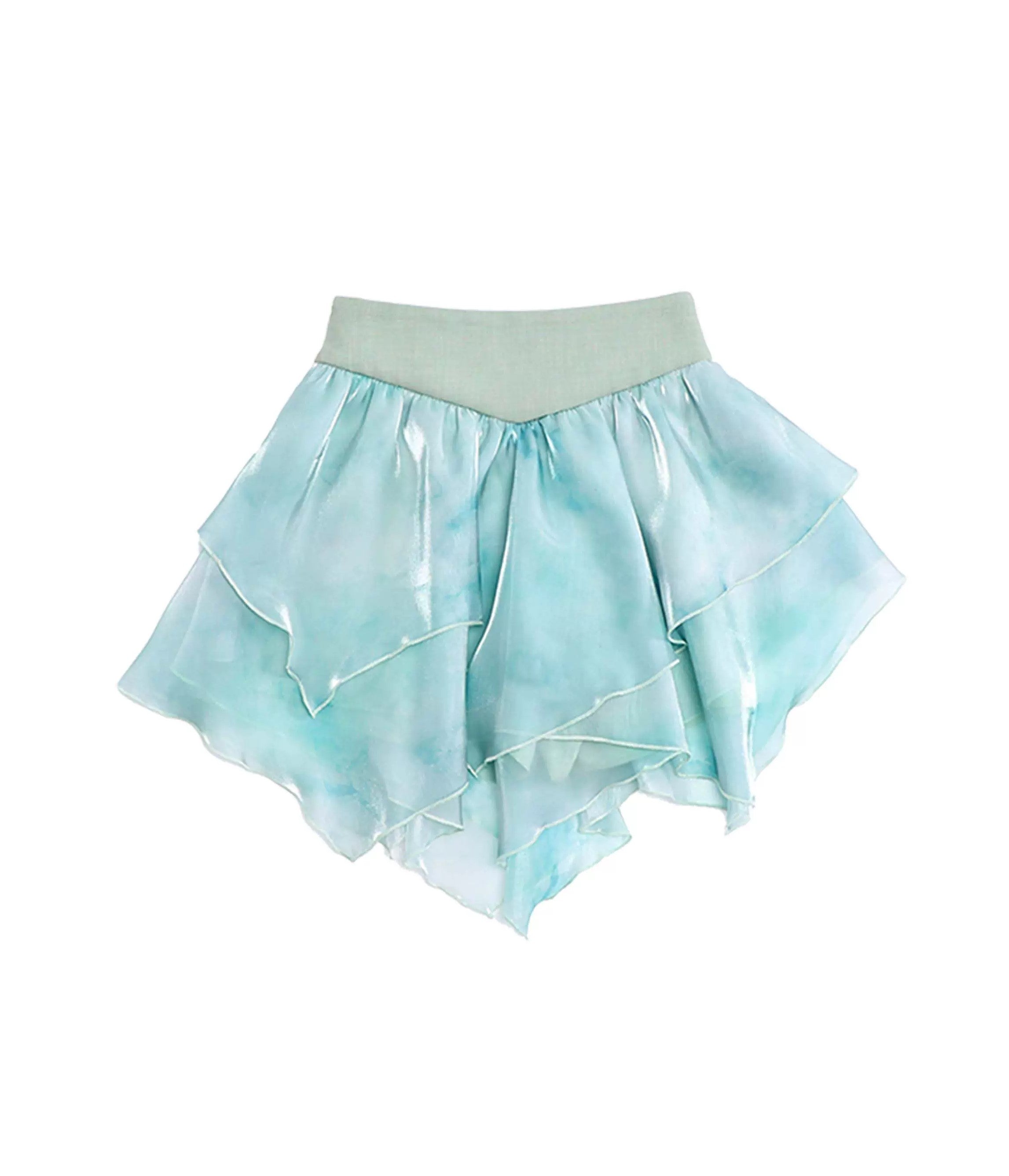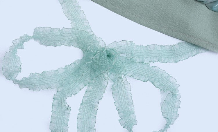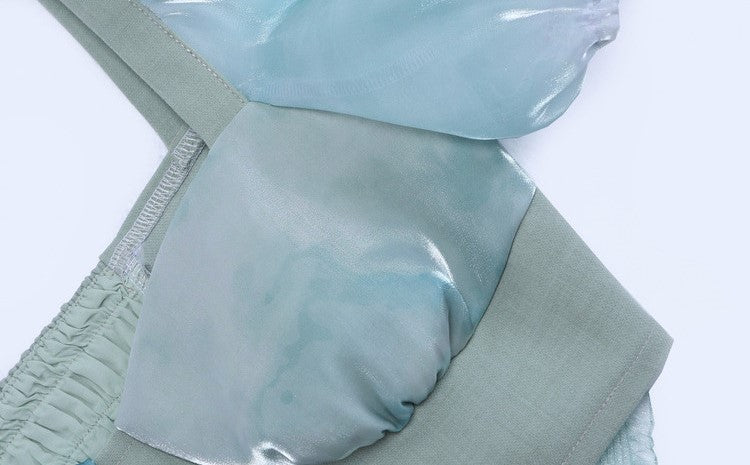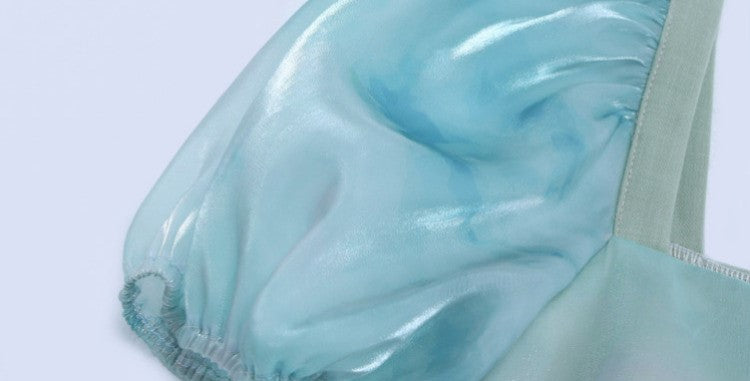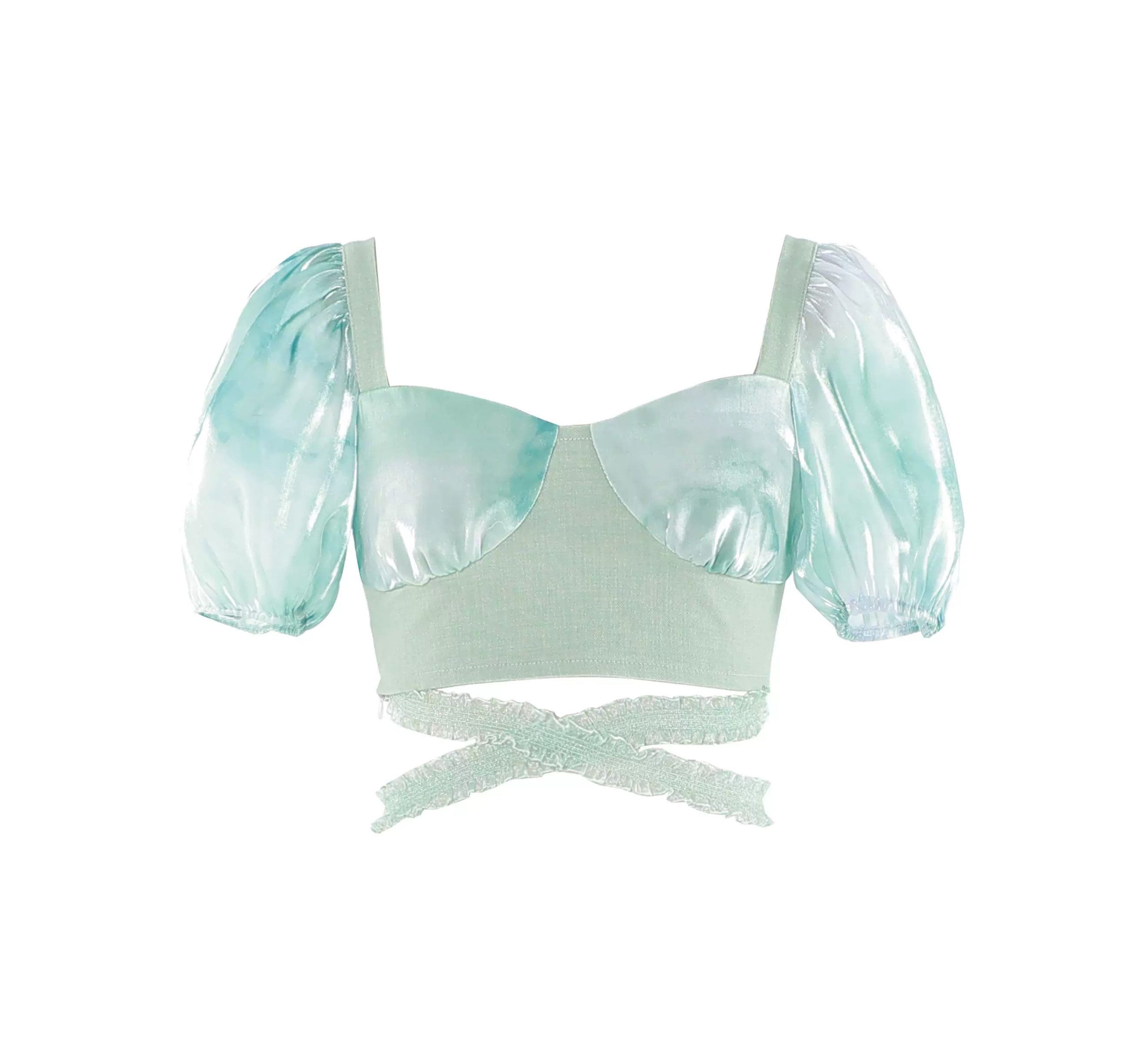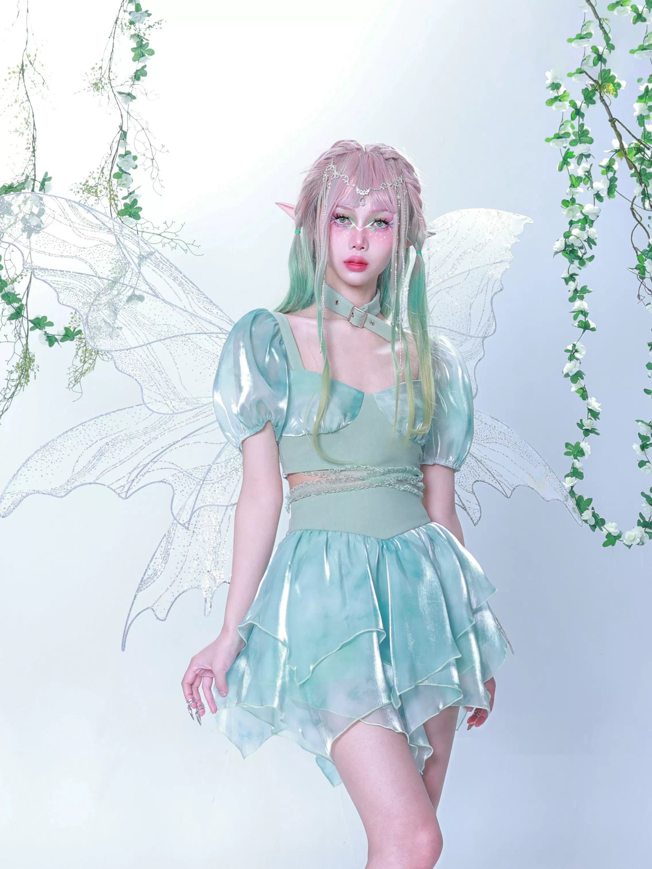 Turquoise Elves Self-tie Sash Waist Puff Sleeves Cropped Top Skirt